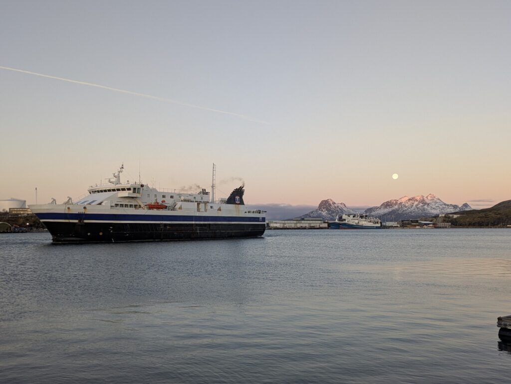 Also Abflug am 04.12., abends ins Comfort-Hotel in Bodø (gelaufen vom Flughafen), morgens Mietwagen geholt und nochmal die Ladeinfrastruktur getestet. Bisher hatte ich als Provider Bilkraft.no, aber die haben nicht überall Stationen. Per Zufall habe ich in der Easypark-App, mit der ich auch das Parking bezahle, gesehen, dass die auch Ladestationen eingezeichnet haben und ich die auch in der App direkt freischalten und bezahlen kann. Sehr praktisch. Da bin ich also am Nachmittag zu einem Geschäftsparkplatz gefahren und hab mich da eine Weile an der Ladesäule hingestellt (hab extra die langsame mit 7kW genommen) und auch noch die Parkgebühren gespart. Die Fähre hatte ich schon online gebucht, hab das Fahrzeug dann in die passende Reihe gestellt und bin nochmal in die Stadt gelaufen.