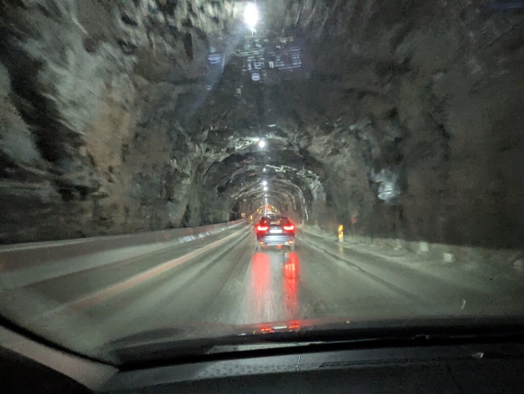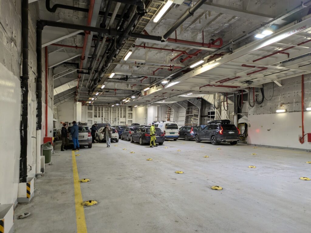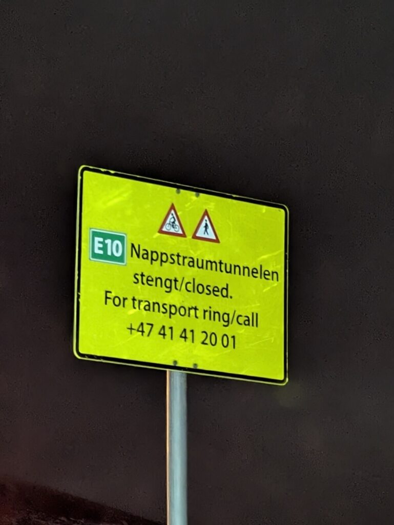 Die Fähre war ziemlich leer, planmässig 16:45-20:00, um 20:15 Uhr konnten wir runterfahren. Dann begann aber ohnehin der Taktverkehr: der Nappstraumtunnelen, der etwa 50km weiter nördlich liegt, wird zur Zeit saniert, d.h. es gibt tagsüber halbstündlich und abends stündlich pro Richtung eine Durchfahrt mit Führungsfahrzeug (ledebil). Also habe ich erstmal alle vorbeifahren lassen, bin dann gemütlich 21:20 in Napp angekommen und hab mich in der Schlange angestellt. Pünktlich 21:30 Uhr kam von hinten der 300er-Linienbus, hat Lichthupe gegeben und vorn fuhr das Führungsfahrzeug los. Alles gut abgestimmt hier. Das Auto ist ein MG4 mit 64kWh und hat praktischerweise ein Ladegerät von Schuko auf CCS dabei. Ich kann direkt ans Wohnzimmerfenster der Unterkunft fahren und das Kabel ist lang genug. Nur die Ladebegrenzung muss ich anpassen, sonst fliegt die Sicherung des Wohnzimmers, wenn die Bodenheizung anspringt. Reproduzierbar getestet 🙂